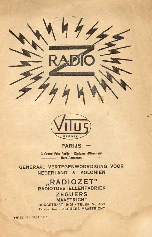 Radiozet (Zeguers), Brugstraat 19-21, Maastricht, Algemeene Radio Installatie Bureau, Achter het Vleeschhuis 28, Maastricht, Hustinkx, G.J.V., Achter het Vleeschhuis 27, Maastricht, Maastrichtsche Radio fabr., Looiersgracht 4, Maastricht en Zelis, N. C., Volksplein 5, Maastricht.