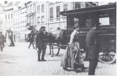Elders op dit forum plaatste Herman onderstaande foto. Het bijschrift is door de maker van de door hem genoemde website een beetje misleidend geformuleerd. Men ziet weliswaar de paardentram (1890-1912) - in Maastricht de paardenomnibus genoemd - stilstaan voor het pand dat tot 1893 het Centraal Café huisvestte (rechts), maar er is van dat café nauwelijks iets van te zien.