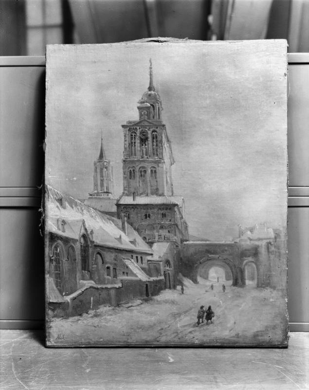 Zicht op de middeleeuwse Sint Martinuskerk, met rechts de Kruittoren. Zien we hier ook de schilder in het vrije veld? Of een militair tekenaar? Of soldaten met een theodoliet?